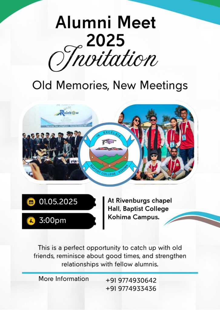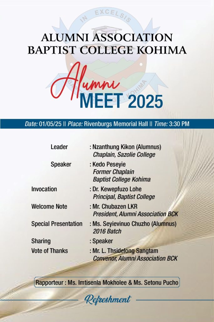 The Alumni Association of Baptist College Kohima (BCK) warmly welcomed former students to the much-anticipated Alumni Meet 2025, held at Rivenburgs Memorial Hall. Nearly 40 graduates, representing the batches from 2002 to 2022, gathered at 3:30 p.m. to rekindle old friendships, reminisce about cherished memories, and celebrate their shared legacy.