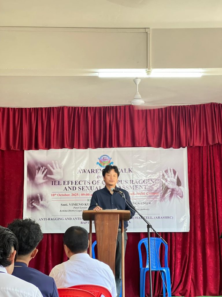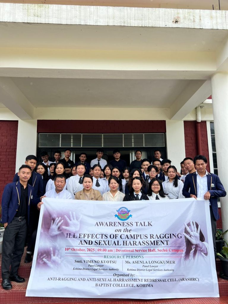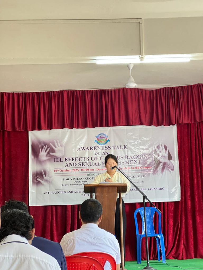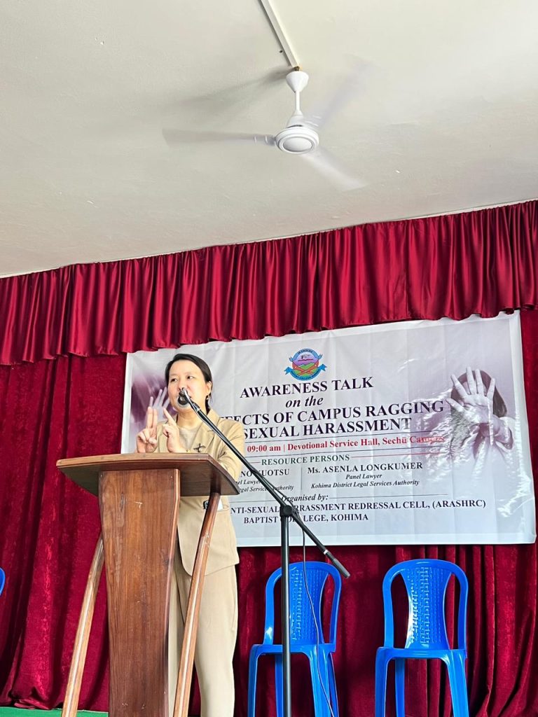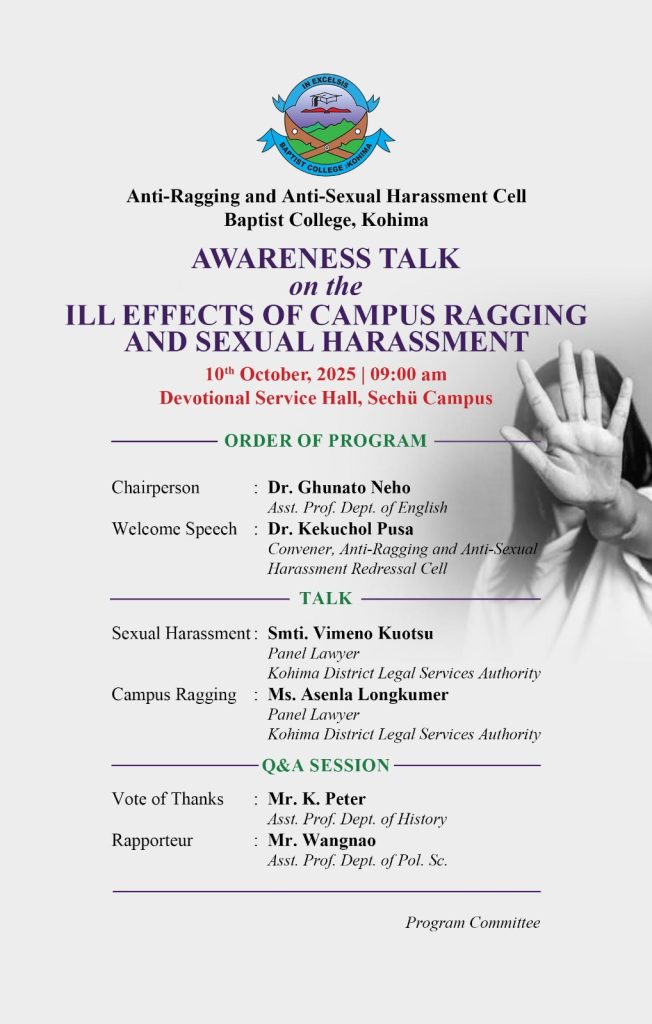 Anti-Ragging and Anti-Sexual Harassment Cell Baptist College, Kohima has successfully conducted an awareness talk on the ill effects of campus ragging and sexual harassment at Sechü campus with Smti.Vimeno Kuotsu and Ms.Asenla Longkumer both Advocate and panel lawyer as resource persons on 10th October,2025 in the Devotional Service Hall, Sechu campus at 9:00 am