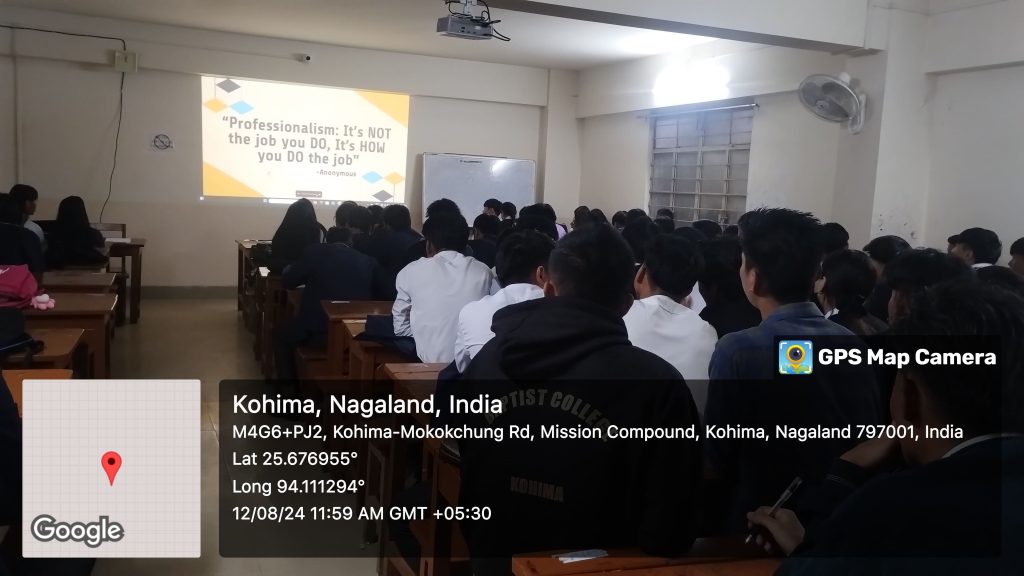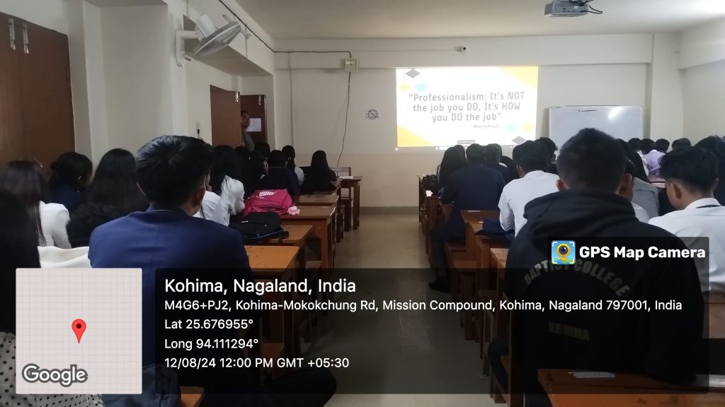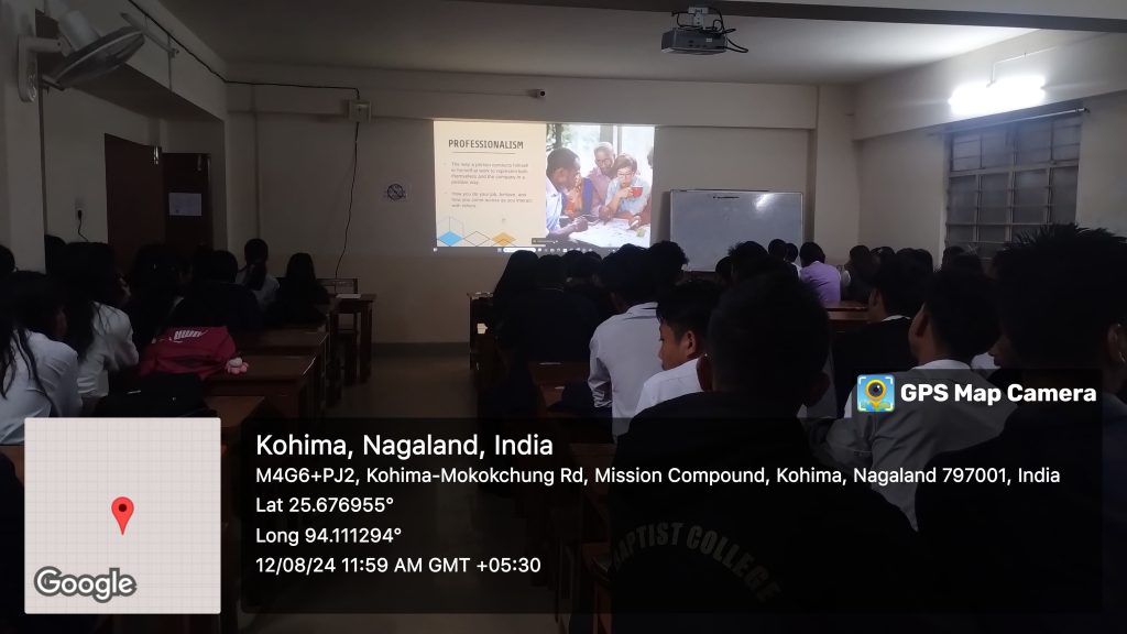 An Audio visual aided class on “Professionalism at Workplace” was presented on 12th August, 2024 as part of the VAC course curriculum for the BA5th semester, Sec- C comprising of Sociology, General and B.Com students by Mr. Kezhalelhou Zatsu, Commerce stream. Audiovisual aids helps the teacher to present the lesson effectively, and students learn and retain the concepts better for a longer duration. The use of audio-visual aids improves student’s critical and analytical thinking.