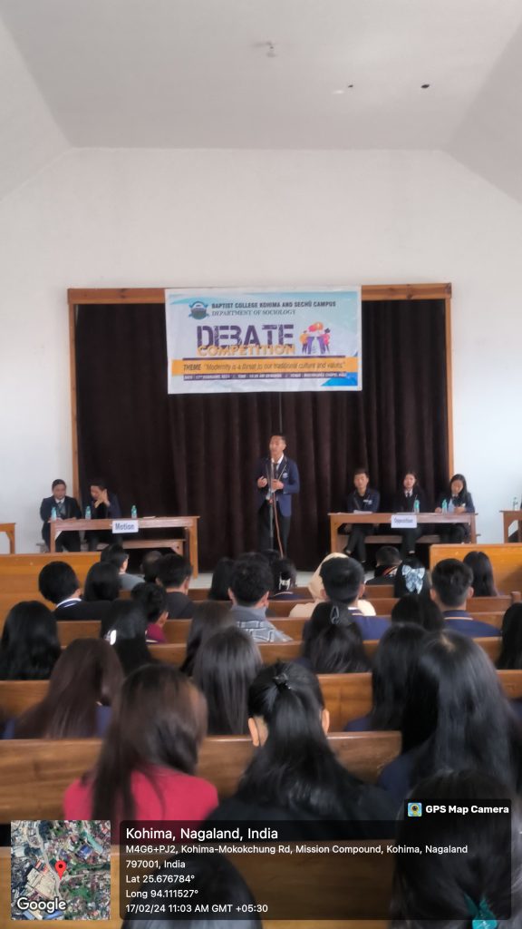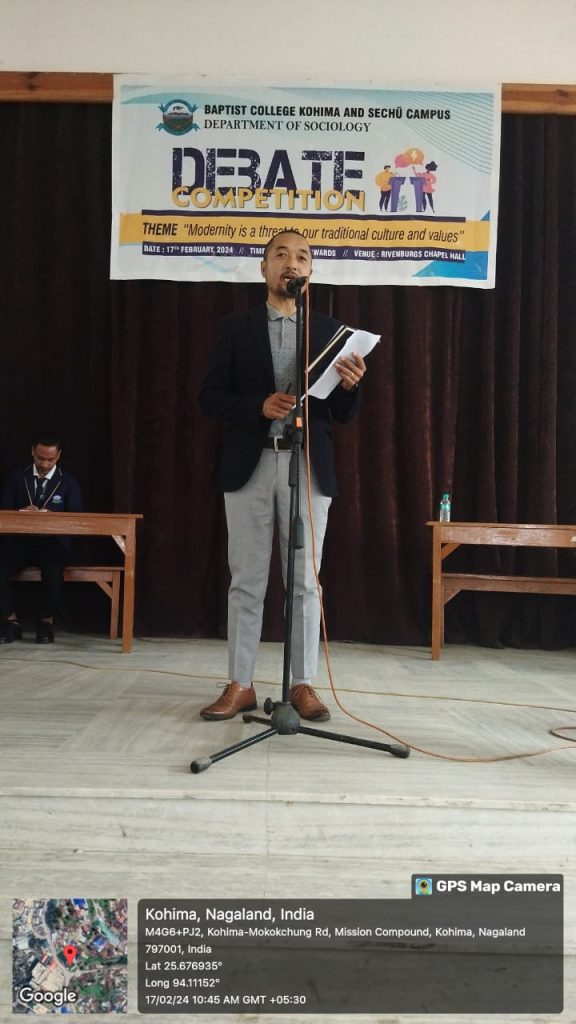 The Department of Sociology, Baptist College, Kohima and Sechu campus organised a debate competition on 17th February, 2024 at Rivenburgs Memorial Chapel, Kohima under the theme “Modernity is a Threat to Our Traditional Culture and Values”. The motion team was adjudged as the winner and Mr. Alumpi of 2nd semester, Sechü Campus as the best debator. Dr. Kewepfuzu Lohe, Mr. Vincent, Mr. L. Thsidelong Rudy and Dr. Videkhono Yhokha were the judges of the competition. Dr. Khobu Tsolo was the moderator while Dr. Kewepfuzu presented a critique on the theme.