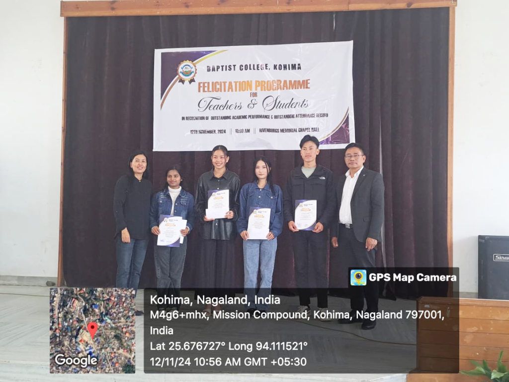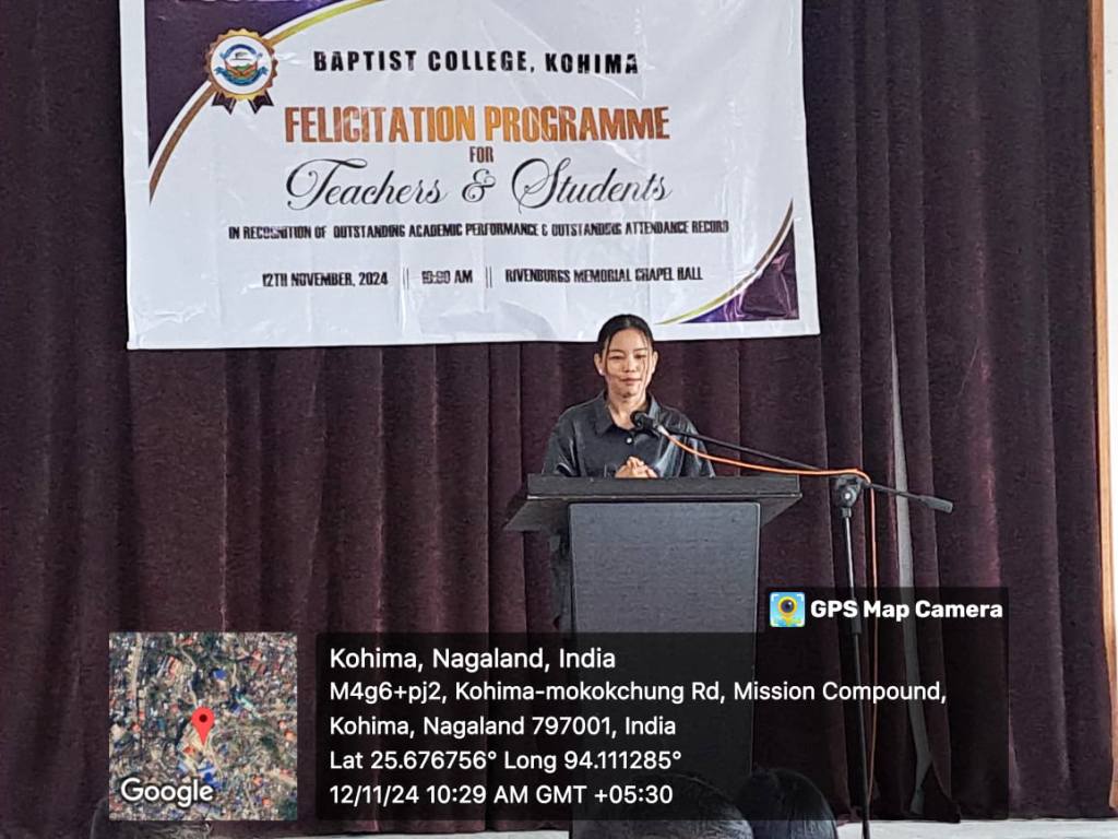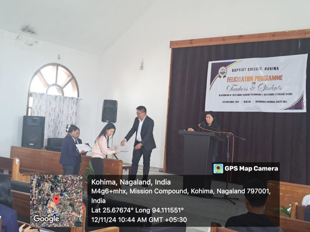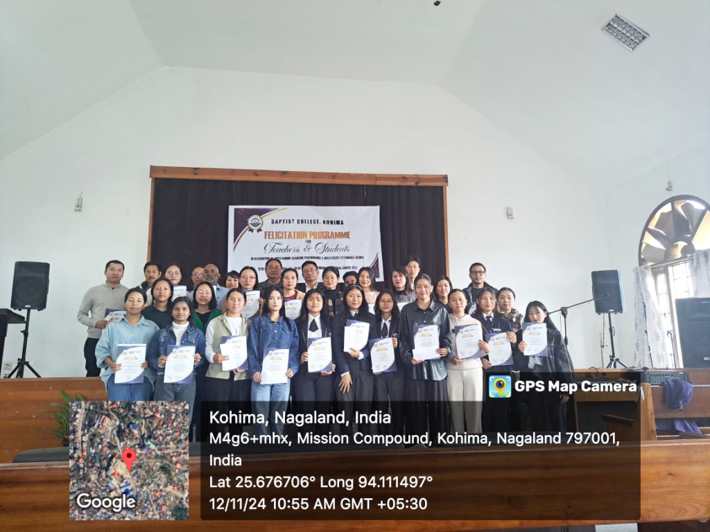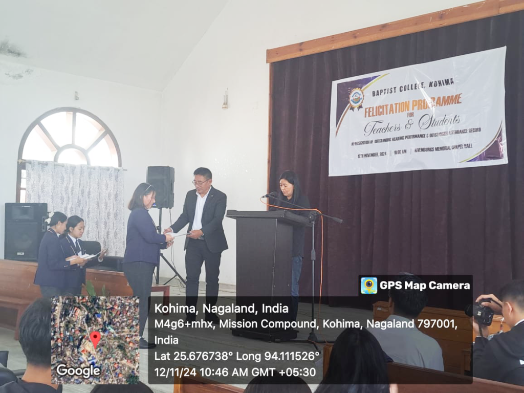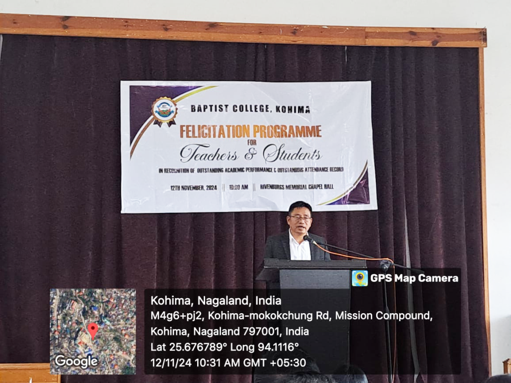 Baptist College, Kohima, organised a felicitation program for the teachers and students on November 12, 2024 at Rivenburgs Memorial Chapel. The event recognised outstanding teachers, students, and administrative staff for their remarkable academic performance and attendance records.