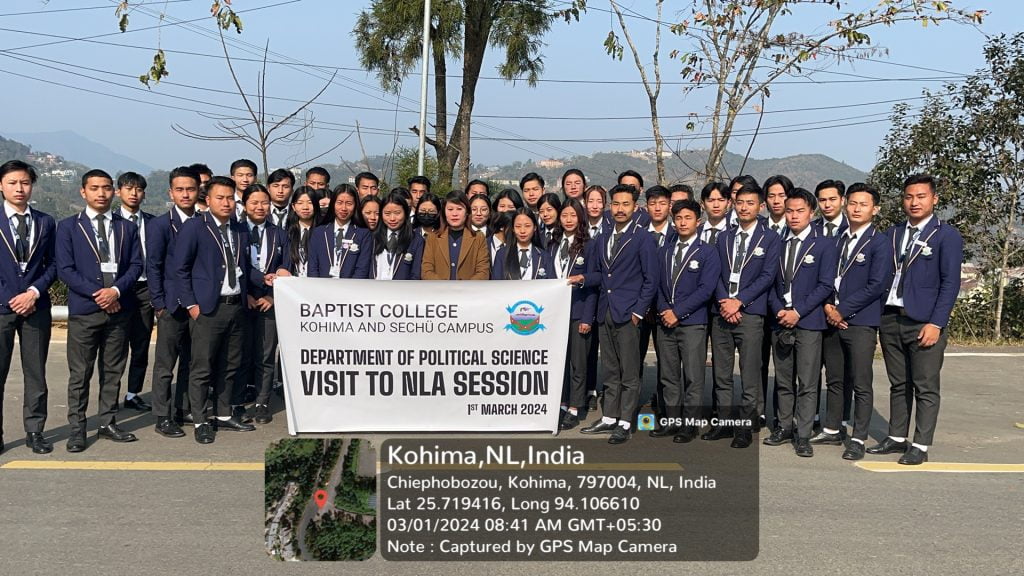 The students of B.A 6th Semester, Department of Political Science, Baptist College, Kohima and Sechü campus visited the 4th session of the 14th Nagaland Legislative Session on 1st March, 2024 at the Nagaland Legislative Assembly Secretariat, Kohima, Nagaland. The students were divided into Two (2) groups and attended the morning and afternoon session.