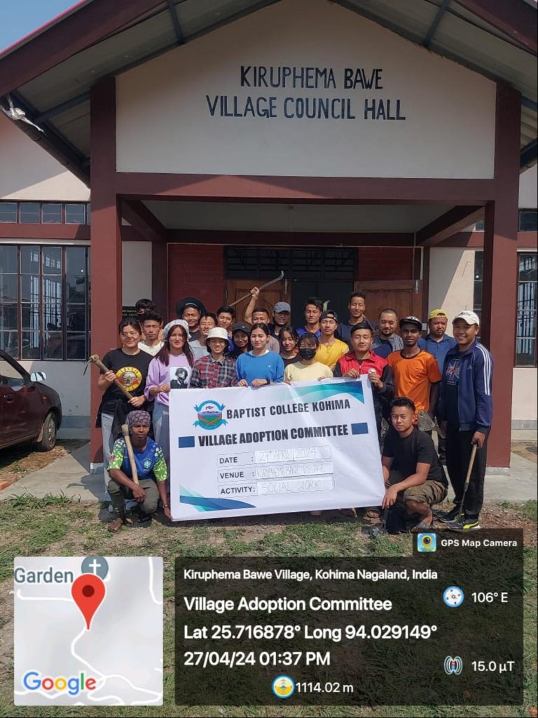 The Village Adoption Committee ,Baptist College Kohima, organized a significant social work at Kiruphema Bawe Village on April 27, 2024. The social work was initiated with objectives to engage students in community services; to help foster a sense of social responsibility; to address the needs of Kiruphema Bawe village and contribute to its development and to strengthen the bond between the college and the local community. The event witnessed active participation from the committee members and instilled a sense of unity and collaboration towards community development. The activity included clearing of the village drainage, cleaning the streets , public areas and the surroundings of the Village Council Hall. Overall there were 24 participants , inclusive of committee members and volunteers. The activity commenced at 10:00 am and concluded at 2:00 pm. The Social work was a success as it not only addressed the immediate needs of the community but also laid the foundation for long-term collaboration and development.